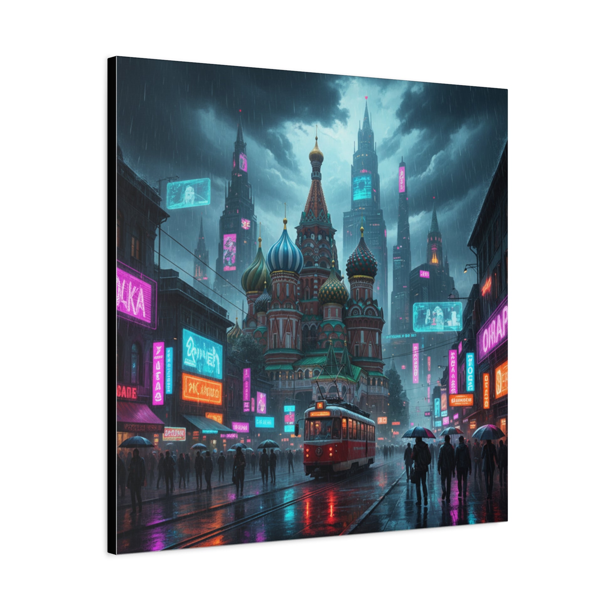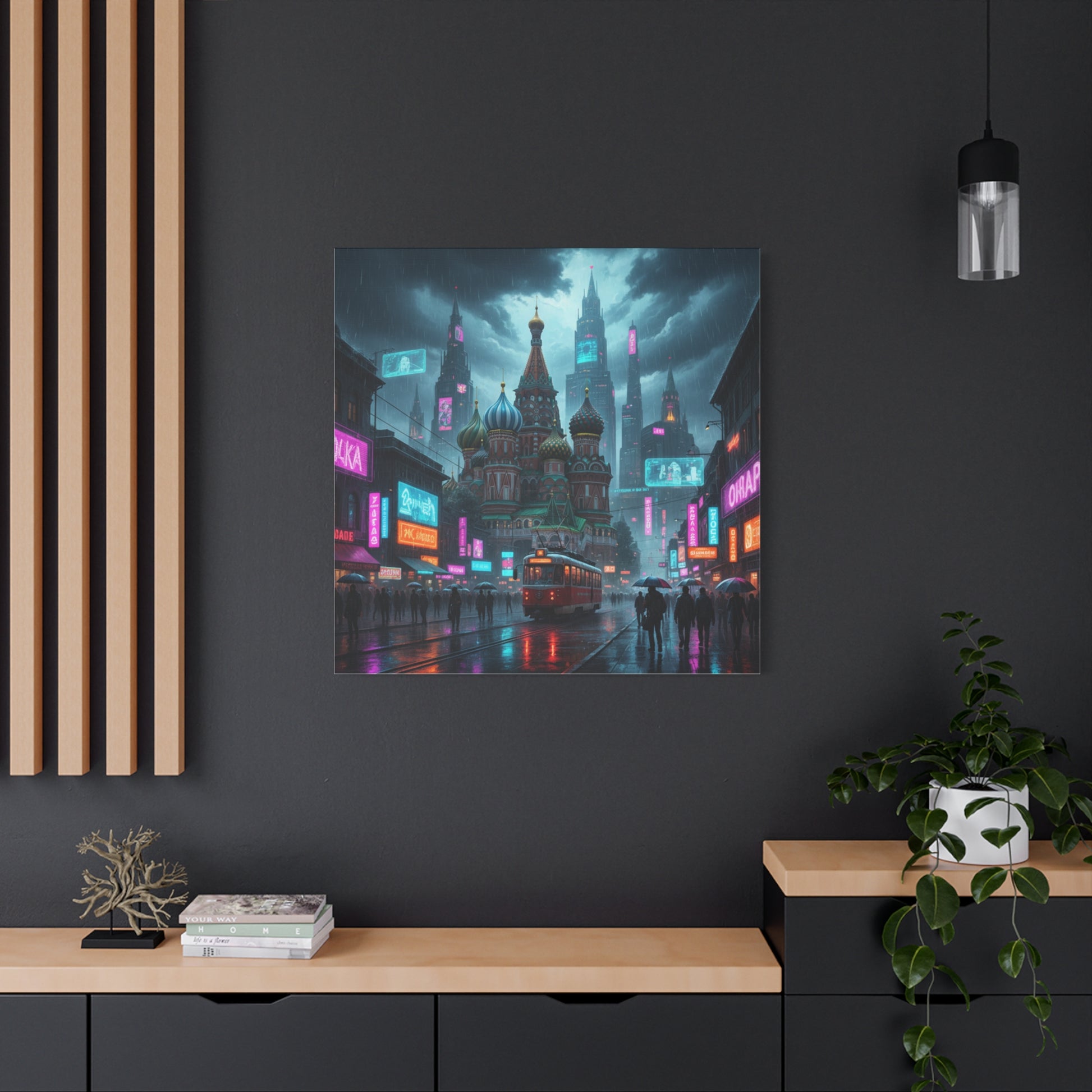A matte stretched canvas that pulls you into a neon-drenched Moscow at night. Cool blues and hot magentas bounce off rain-slick streets and glass facades, creating an immersive cyberpunk skyline you can lose yourself in. Hung in a studio or living room, it adds an edge — the kind that sparks late-night conversations, fuels creative work sessions, and grounds a tech-forward aesthetic. Lightweight but substantial, the artwork feels like a window into a future city: gritty, electric, and quietly beautiful.